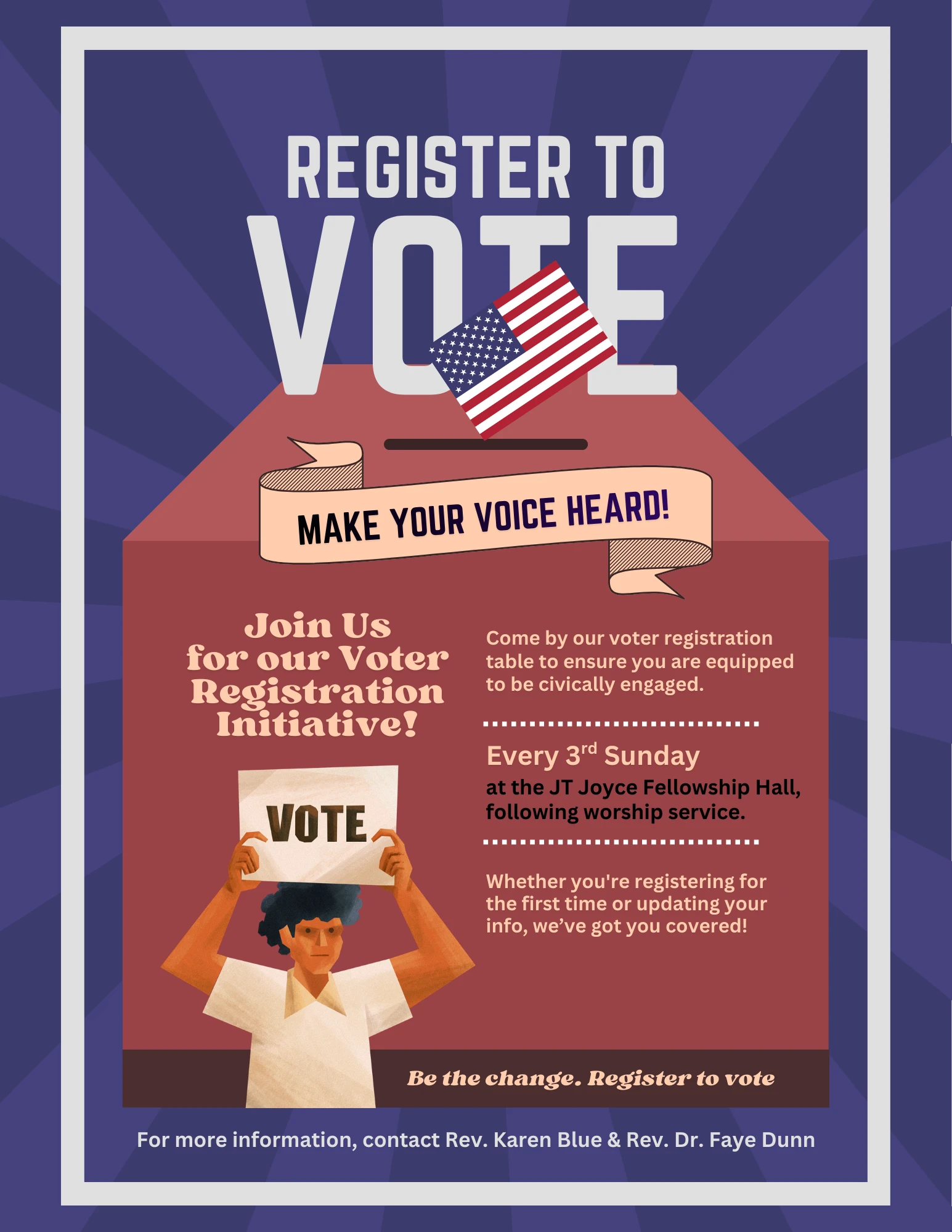 Are you registered to vote? Is your voter information current? If the answer is 'No' or you're unsure, not to worry, because we are here to make sure you get your voter status up-to-date. Connect with us on every 3rd Sunday following worship at the JT Joyce Fellowship Hall and get registered to vote. Use your voice by engaging your vote!